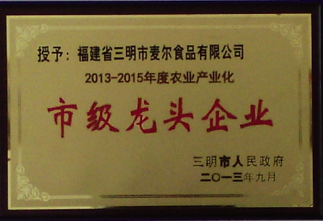 2013年10月15日,我司榮獲2013—2015年度農業產業化“市級龍頭企業”稱號,這是我司連續第3次榮獲此項殊榮。